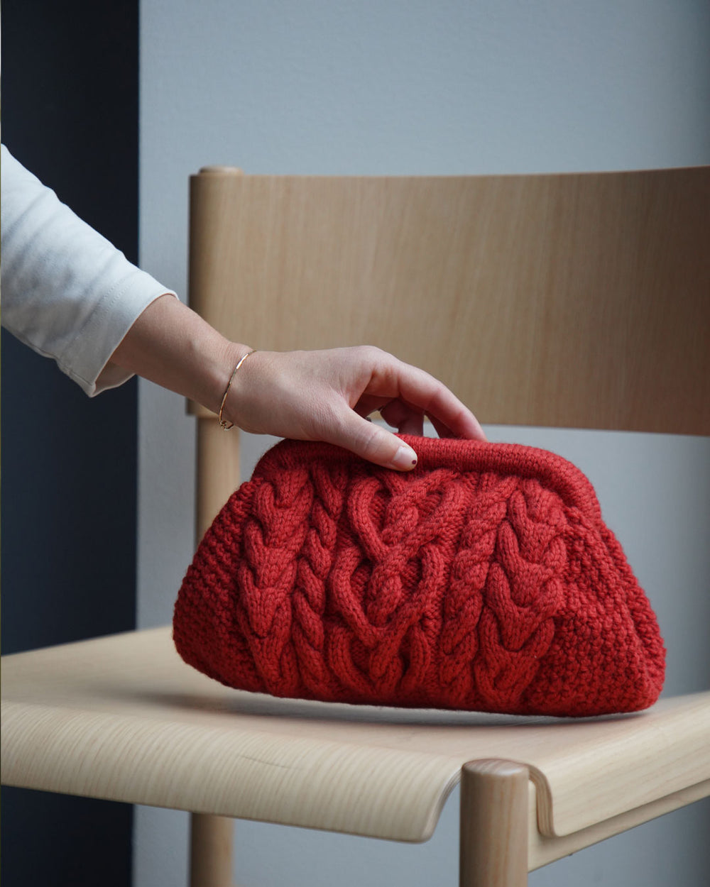 這款手拿包使用柔軟的 100% HIGHLAND 高地羊毛線,按照織圖編織而成。