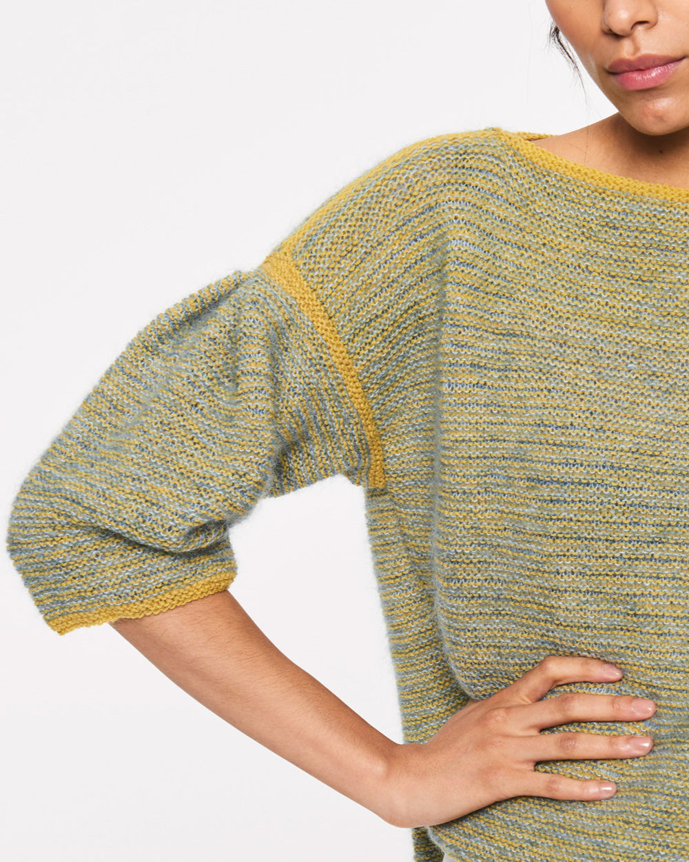 條紋模樣以一股 HIGHLAND MINI 高原細羊毛線和兩股不同色絲毛海交替編織而成。