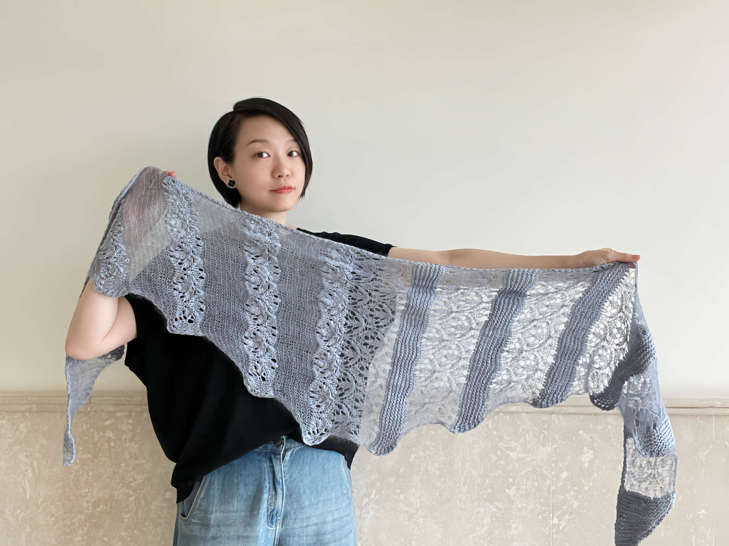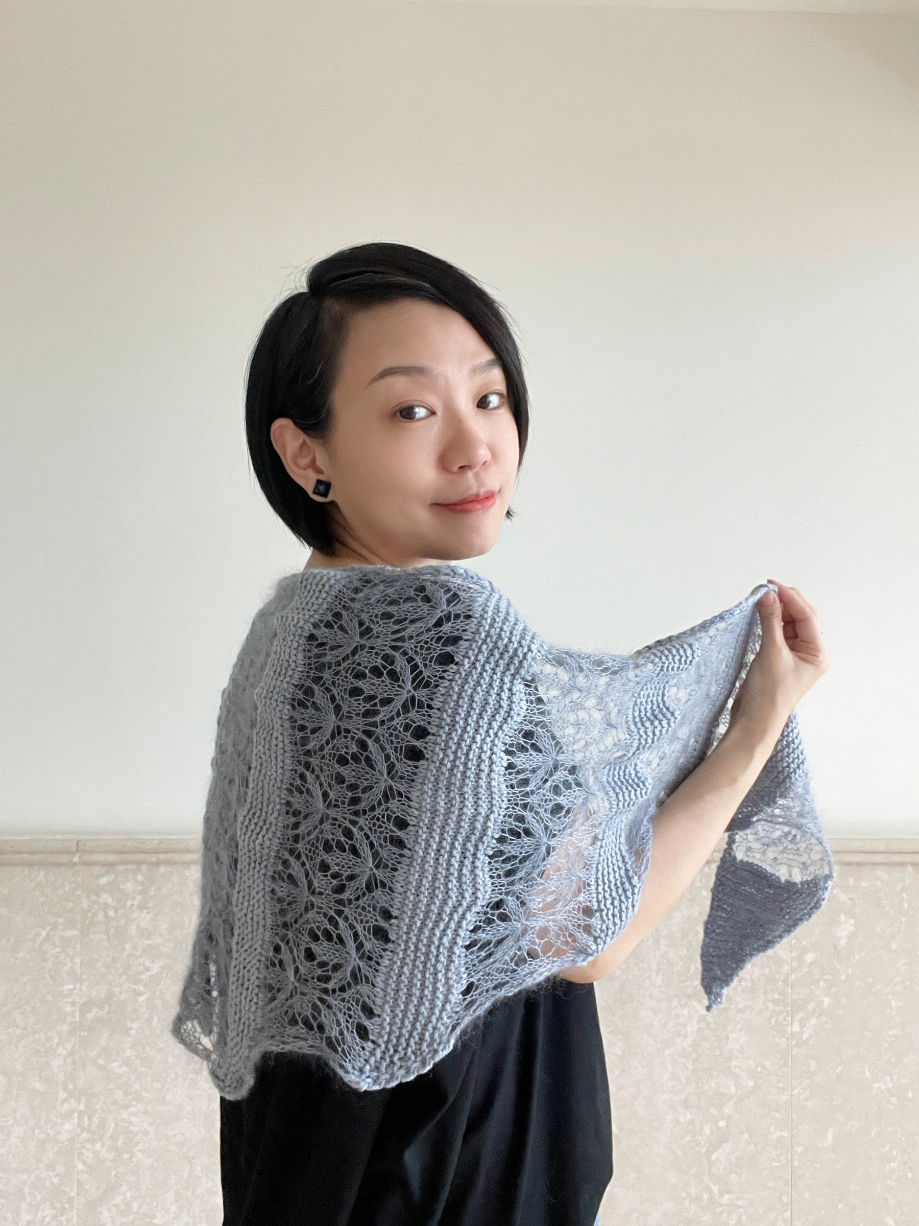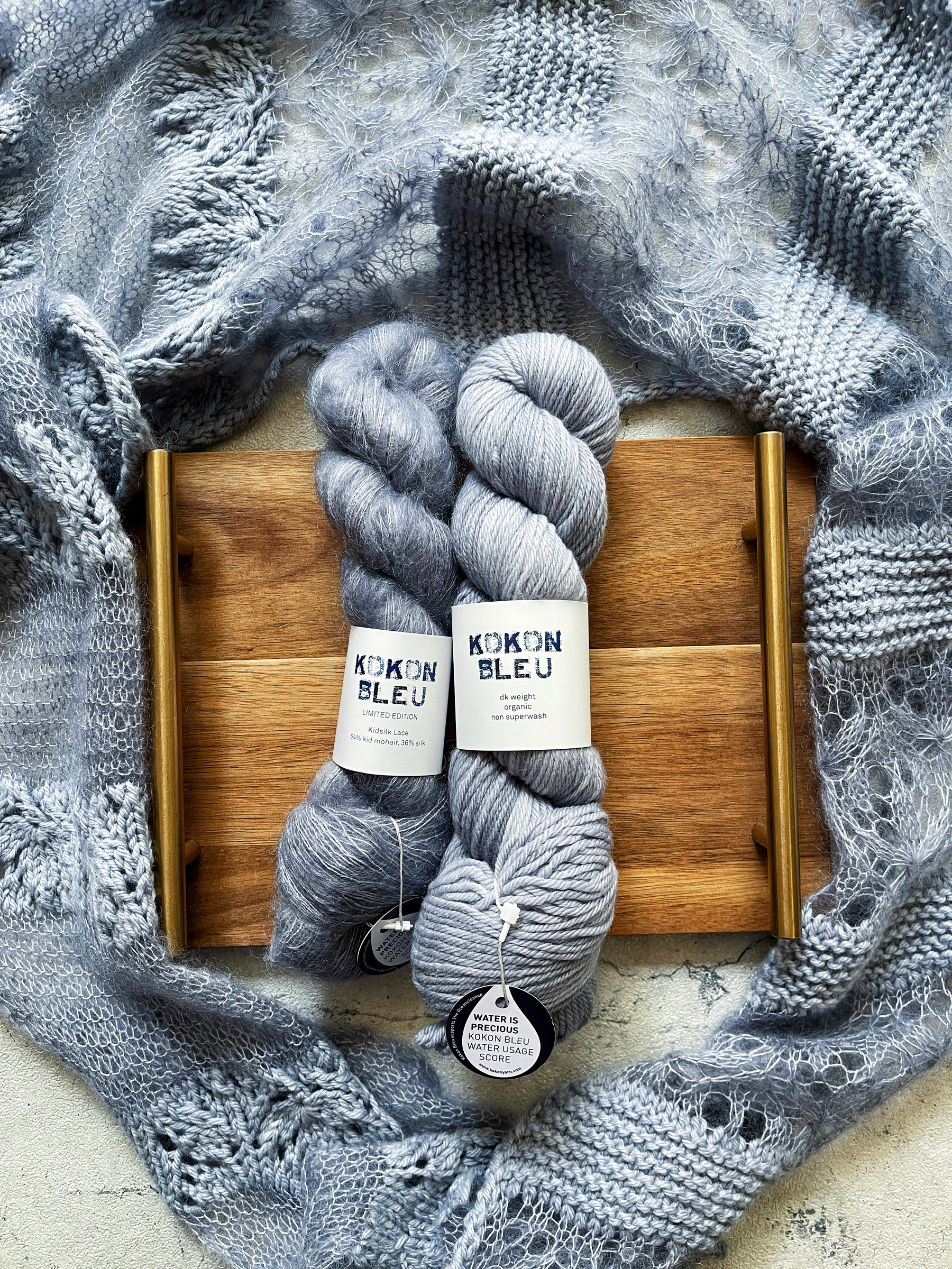 這次店主 Tomo 以 KOKON Bleu 家大受好評的Jean Michel 系列,為 Eri 設計的這條 Walking with Nala 披肩搭配材料包套組,材料包包含一絞 Kokon Bleu DK Merino 與一絞 Kokon Bleu Kidsilk,三種不同色調的牛仔配色讓你也能擁有屬於你自己的牛仔藍染 walking with Nala 披肩。